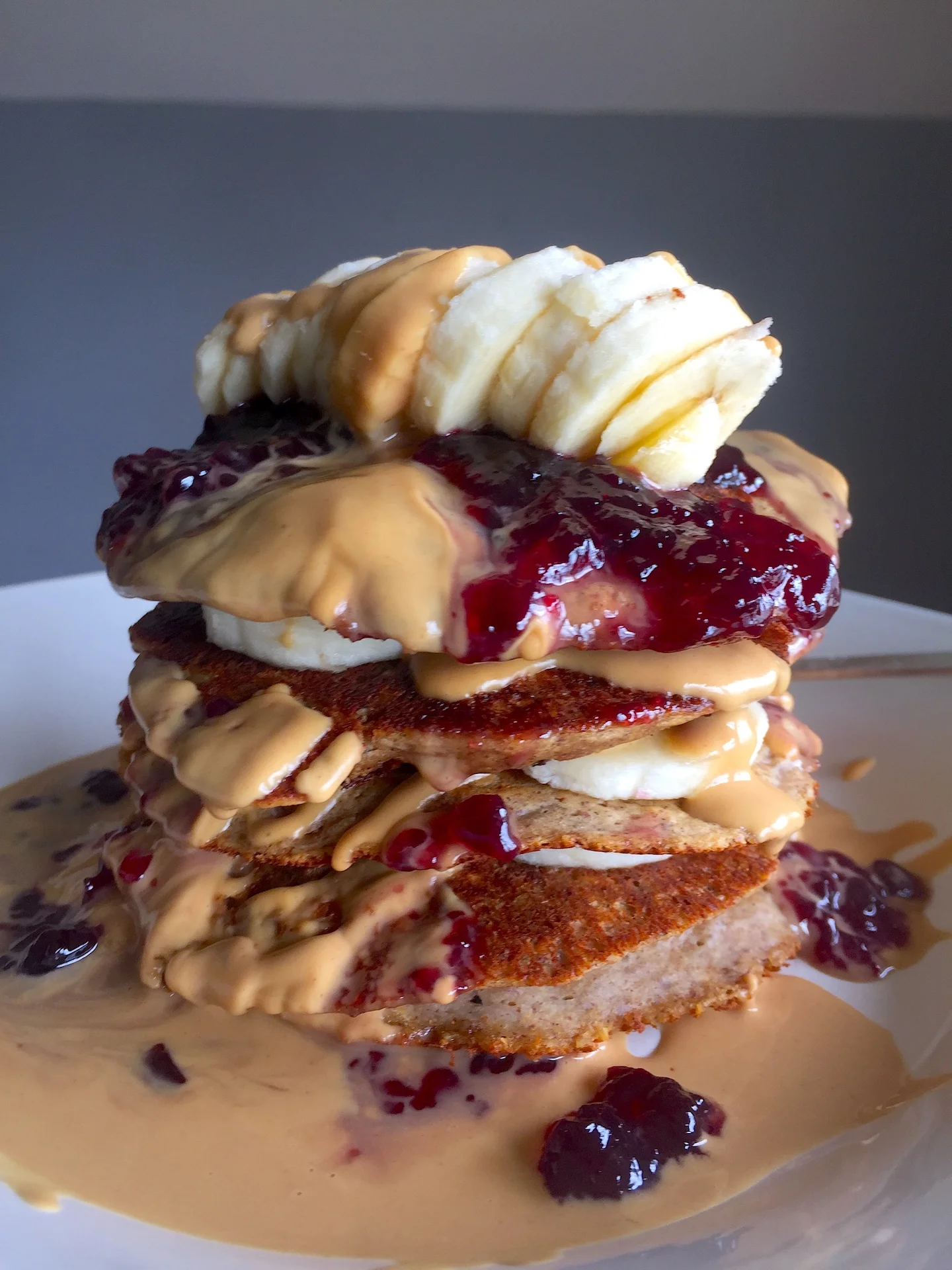 I have really been craving peanut butter and jelly flavors lately... after the gym, for breakfast, for dinner, and almost anytime of day this classic combo sounds good to me. Instead of the classic combo on a sandwich, I usually tend to want more goop than bread. I've been working on perfecting the ratio of peanut butter to jelly to bread in the form on pancakes. Most of the time the end result is so sloppy that it doesn't make for the prettiest picture but it takes delicious. This stack hit on all levels... taste, texture, macros, sweet to salt, goop to pancake, and it had visual appeal. I paired the stack with a fresh banana to add volume and some more nutrients. Serve these with your favorite non-dairy milk and be transported to a simpler time.