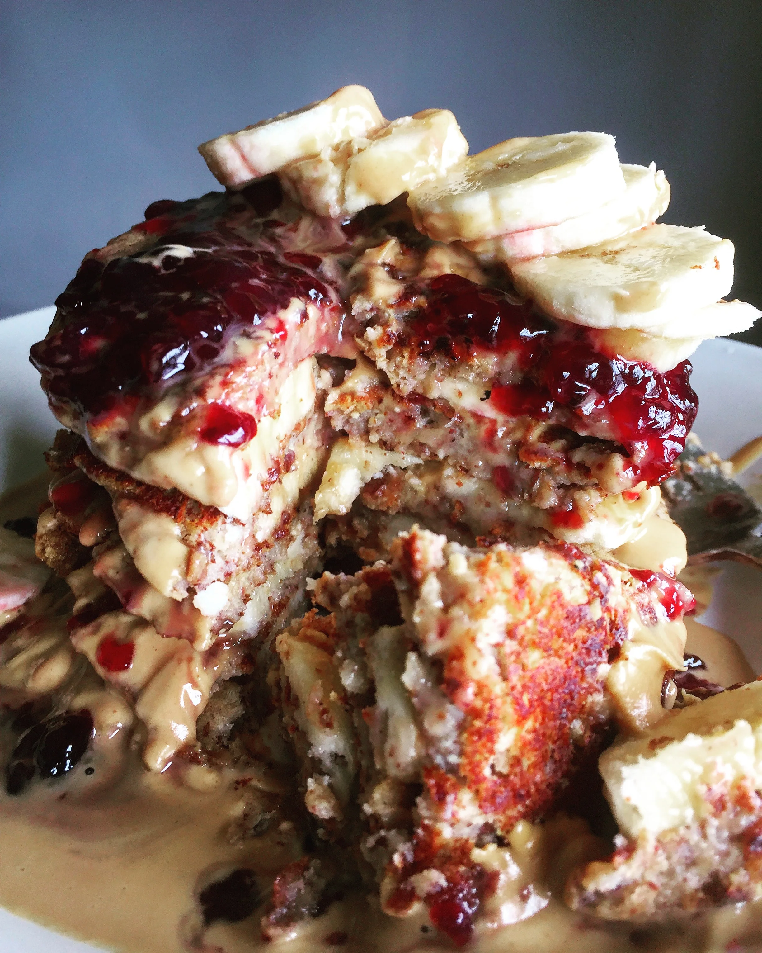 PEANUT BUTTER & JELLY VEGAN PROTEIN PANCAKES