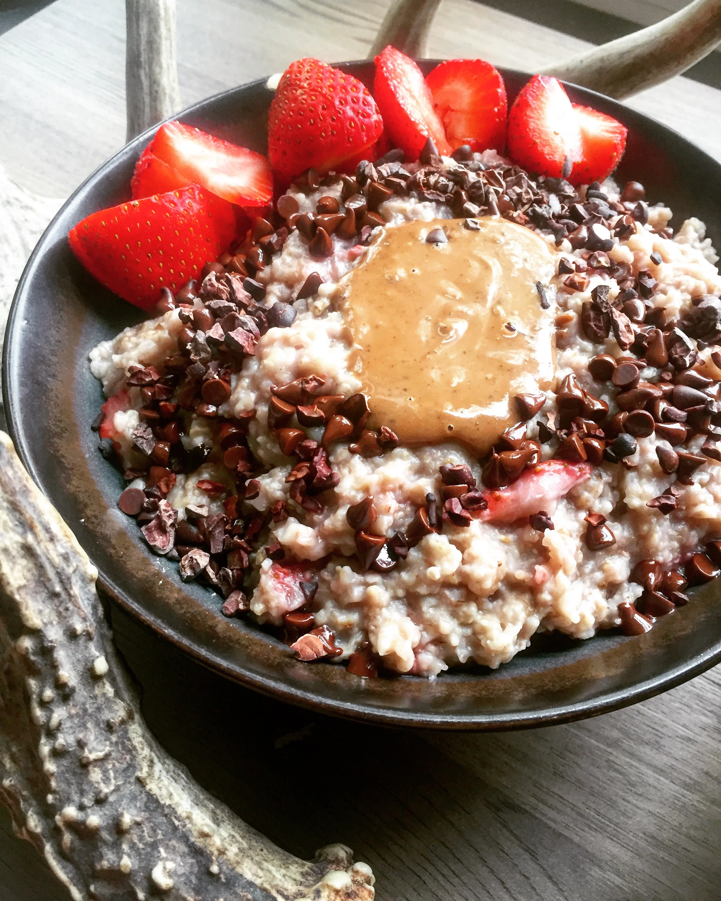 - To plate... Place the greek yogurt in a bowl and top with oats, remaining strawberries, chocolate chips, peanut butter, and cacao nibs.