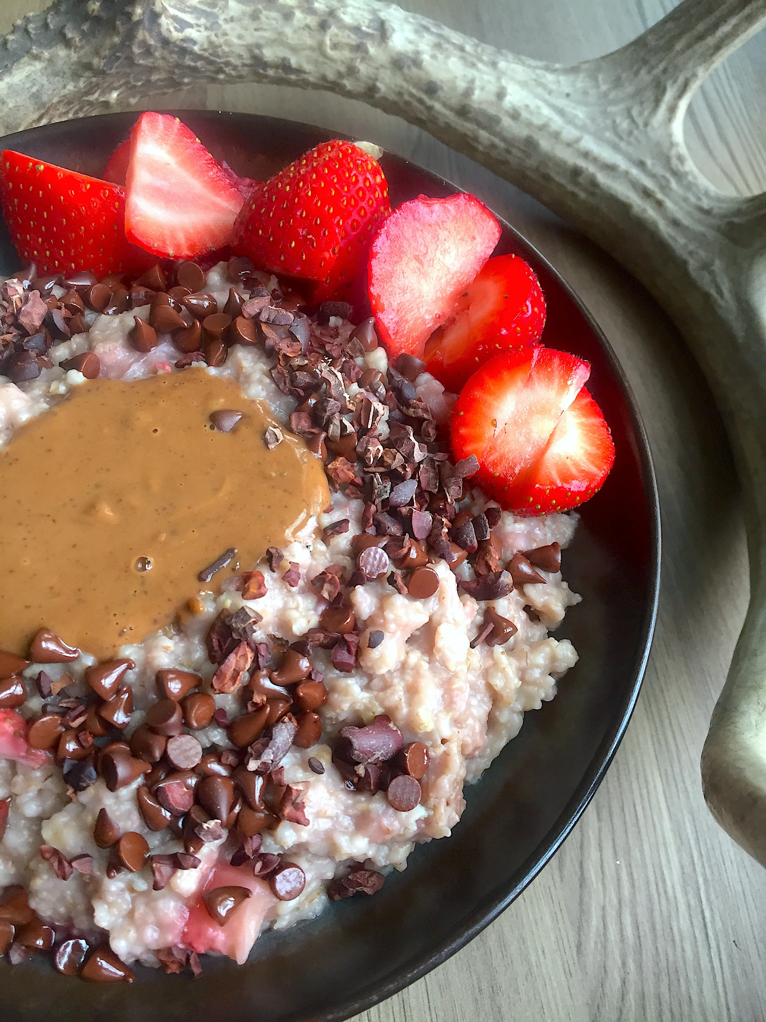 Oatmeal is the perfect meal to decide how you want to nutritionally start your day. You can keep them high carb for a serious energy boost. If you feel undernourished, you can pack them with healthy fats like flax seeds, chia seeds, MCT Oil, or cook them with nut milk. If you want higher protein you can add in protein powders, hemp powder, cook them with soy milk, or serve them on a scoop of high protein greek yogurt. In the case of these oats, I upped the protein by using a vanilla protein powder and paired it with cooked in strawberries to create a creamy and sweet serving of oats.
