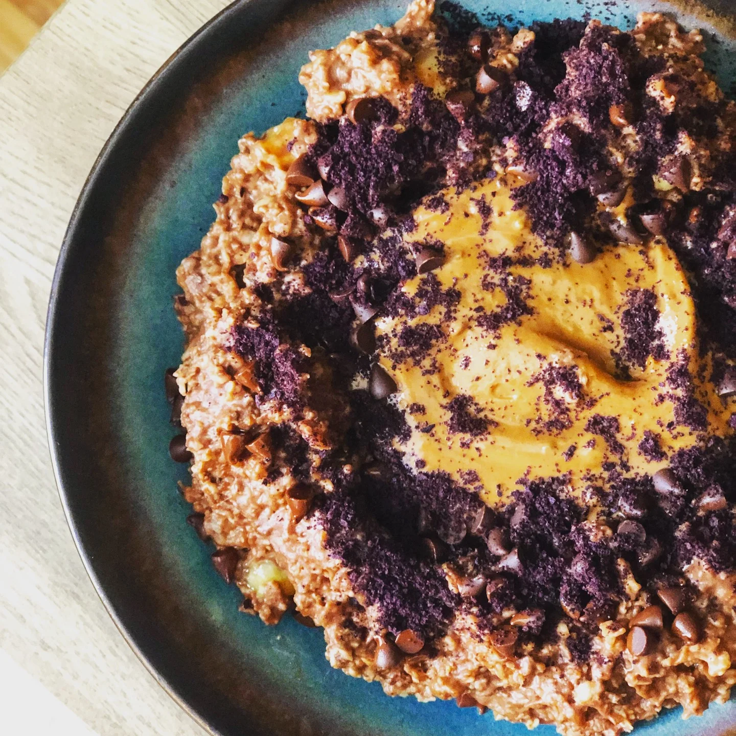To plate... Place the oatmeal in a bowl and top with açaí powder, chocolate chips, and peanut butter.